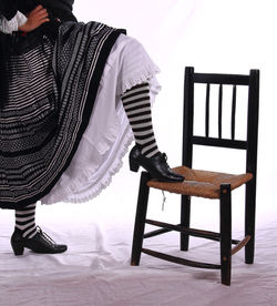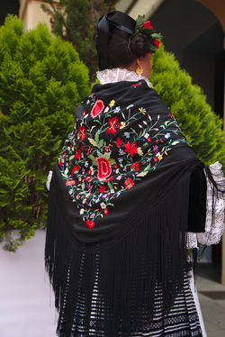 En el Vestuario de Chica el jugón o jubón normalmente es de terciopelo negro con cuello redondeado y manga larga. En el cuello y las bocamangas o puños y medio antebrazo va adornado con puntillas de bolillo blanca almidonadas. El refajo blanco y negro se denomina de "costilla de vaca", no predominando ninguno de los dos colores. El dibujo está formado a base de listas hasta un poco mas del medio refajo y a continuación dibujos de diferentes maneras en forma de mosaico rematándose con un hilo de la misma lana en forma de cordón blanco y negro igualmente. De este refajo hay diferentes variaciones en cuanto al dibujo, siendo el de las fotografías el más real y el largo hasta media pierna. La forma del refajo es de tablas con una tabla más ancha que las demás en la parte central delantera y un macho en la parte central trasera. Son refajos tejidos en telares. Además, el traje se complementa con el mandil de raso negro sin brillo, de forma redondeada, bordado con rosas y ramilletes de colores donde predominan el rojo y el verde y rematado con puntilla negra alrededor. En cuanto a la faltriquera también negra de raso va bordada de la misma manera con su oportuna apretura en el centro rematada con cinta de raso. El mantón es el elemento quizá más característico de esta indumentaria siendo de raso negro bordado con los mismos motivos florales que el mandil aunque con más riqueza que éste. Es un mantón de cuatro picos y con una medida de 150 x 150. El bordado está solamente en uno de los picos y rematado con un fleco negro de seda de unos 35 - 40 cms. de largo. Por la parte trasera se suele colocar justo por debajo de la puntilla del cuello y recogido hasta la primera flor bordada, y por la delantera va cruzado montando el lado derecho sobre el izquierdo. El traje lo completan las medias de listas horizontales blancas y negras, zapato negro atado con hiladillo o cinta de raso negra, los aderezos tales como pendientes dorados de media luna y cruz dorada de 3 puntas atada al cuello con un cordón de terciopelo o en su defecto cinta de raso o hiladillo. En cuanto al peinado cabe destacar los dos rodetes de trenzas en cada lado de la cabeza con la raya al medio y en la parte trasera una trenza de 8 cabos. La flor, o bien geranio o bien amapola en color rojo, va prendida al lado derecho y el lazo negro de raso en la parte trasera.